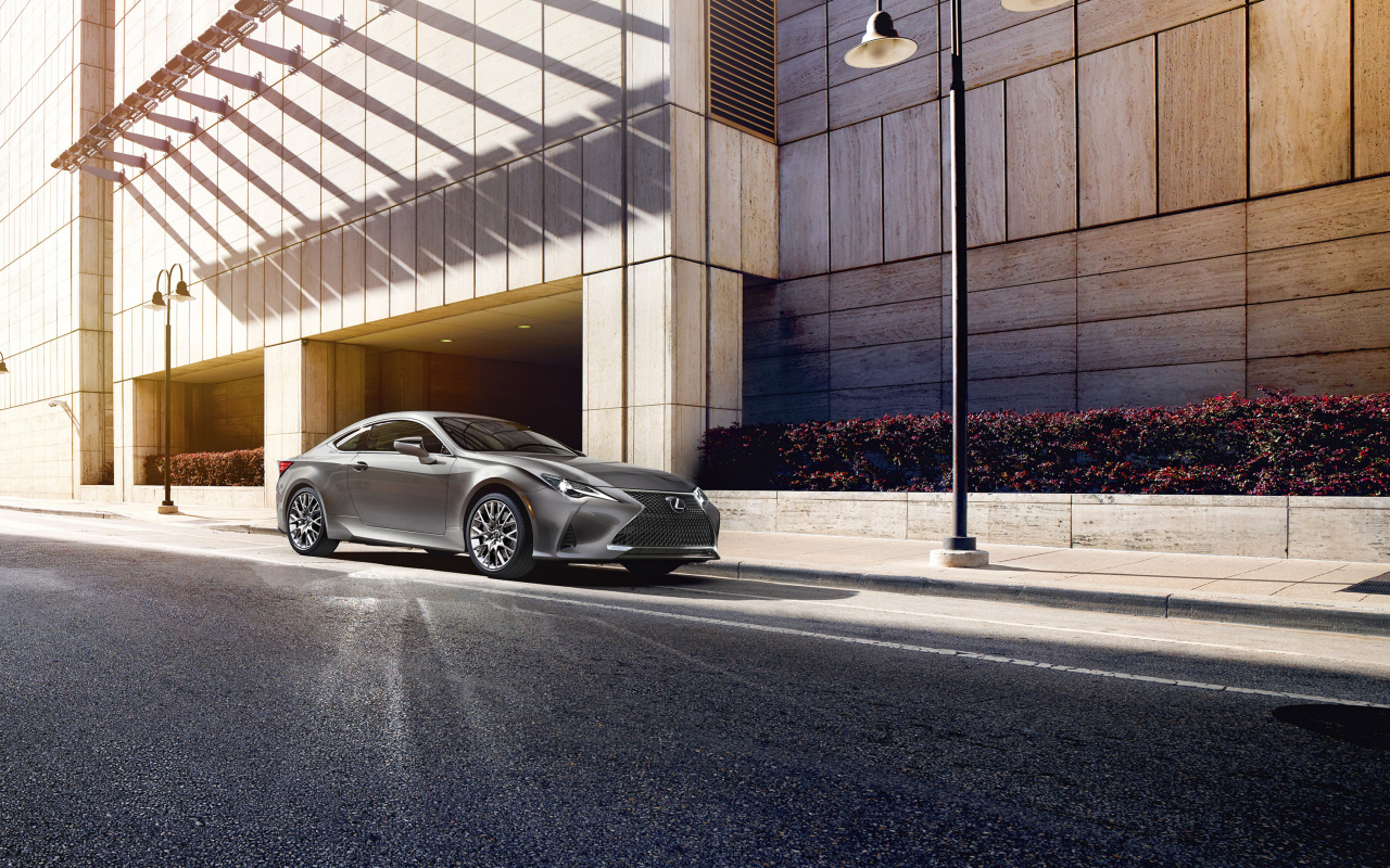 Серебристый автомобиль Lexus RC 300, 2019 года у здания Обои для рабочего стола 1280x800