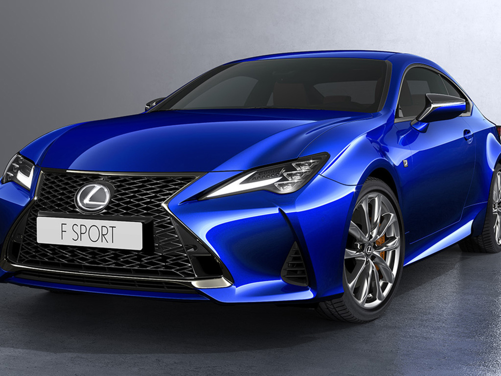 Синий автомобиль Lexus RC 350 F SPORT, 2019 года на сером фоне
