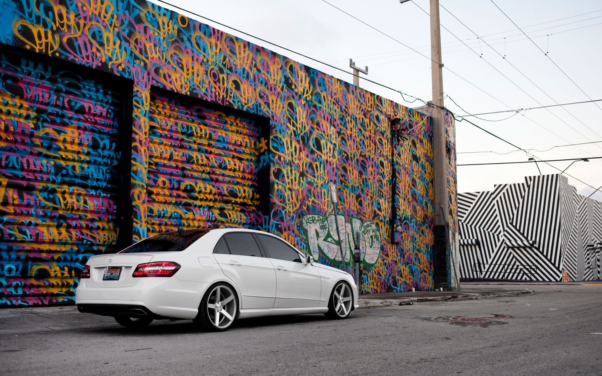 Обои: Белый Mercedes-Benz у раскрашенного гаража