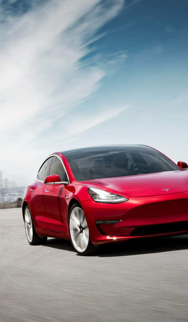 Красный автомобиль Tesla Model 3, 2018 года на фоне неба Обои для рабочего стола 600x1024