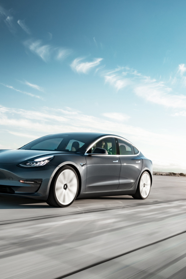 Серебристый автомобиль Tesla Model 3, 2018 года на трассе Обои для рабочего стола 640x960