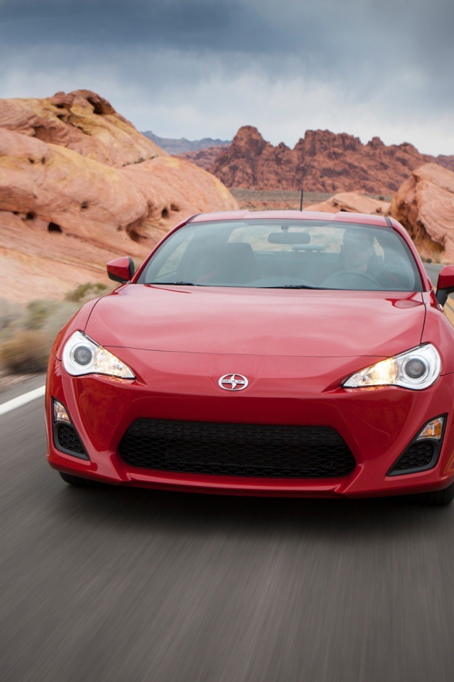 Красный автомобиль Toyota GT86 на трассе Обои для рабочего стола 640x960