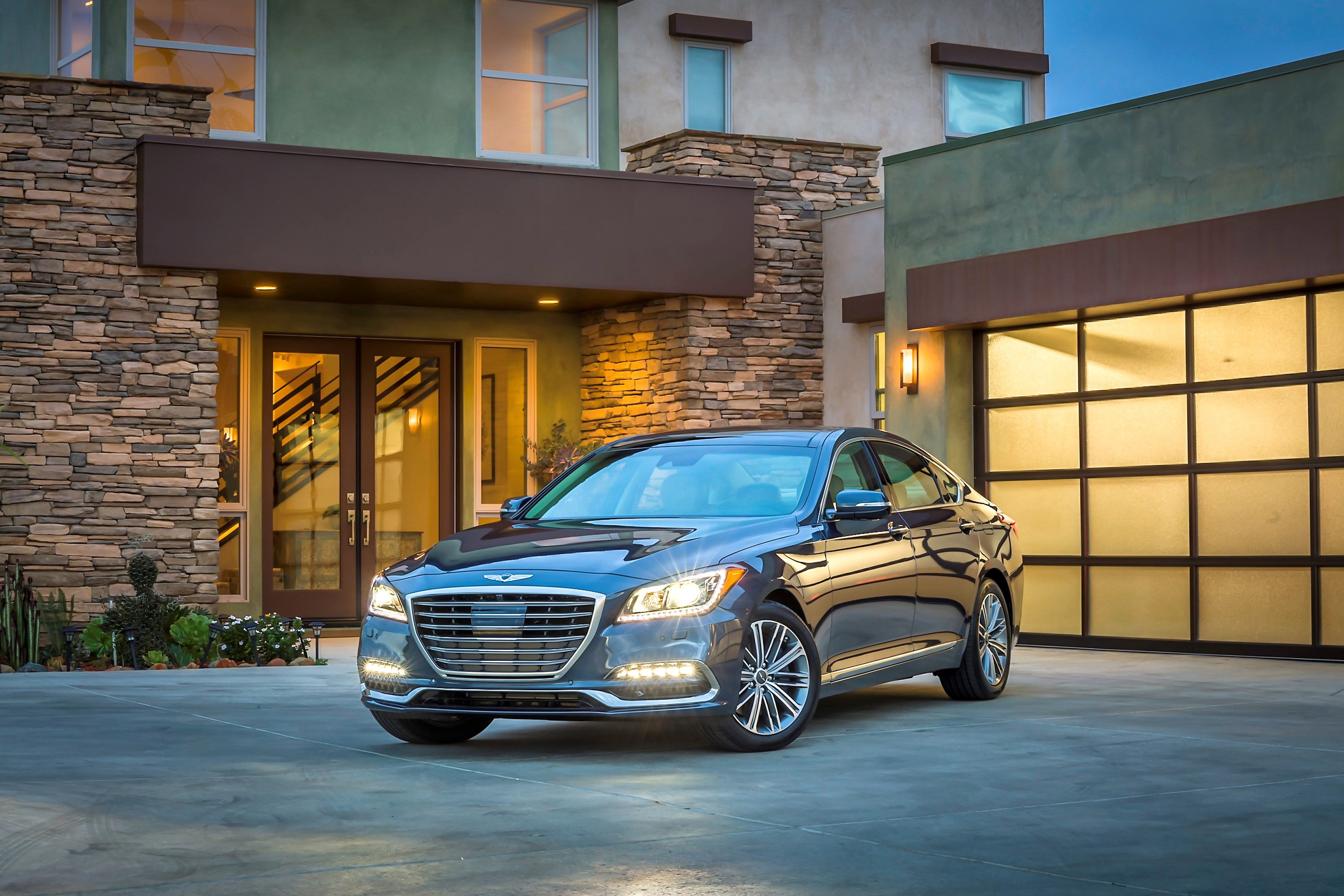 Серебристый автомобиль Genesis G80 с включенными фарами - 3600x2400