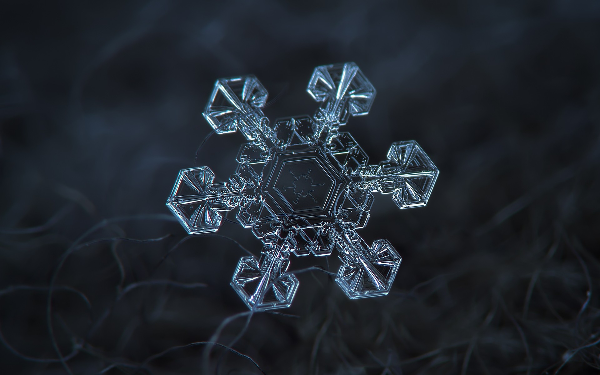 Снежинка под увеличением на черном фоне - 1920x1200
