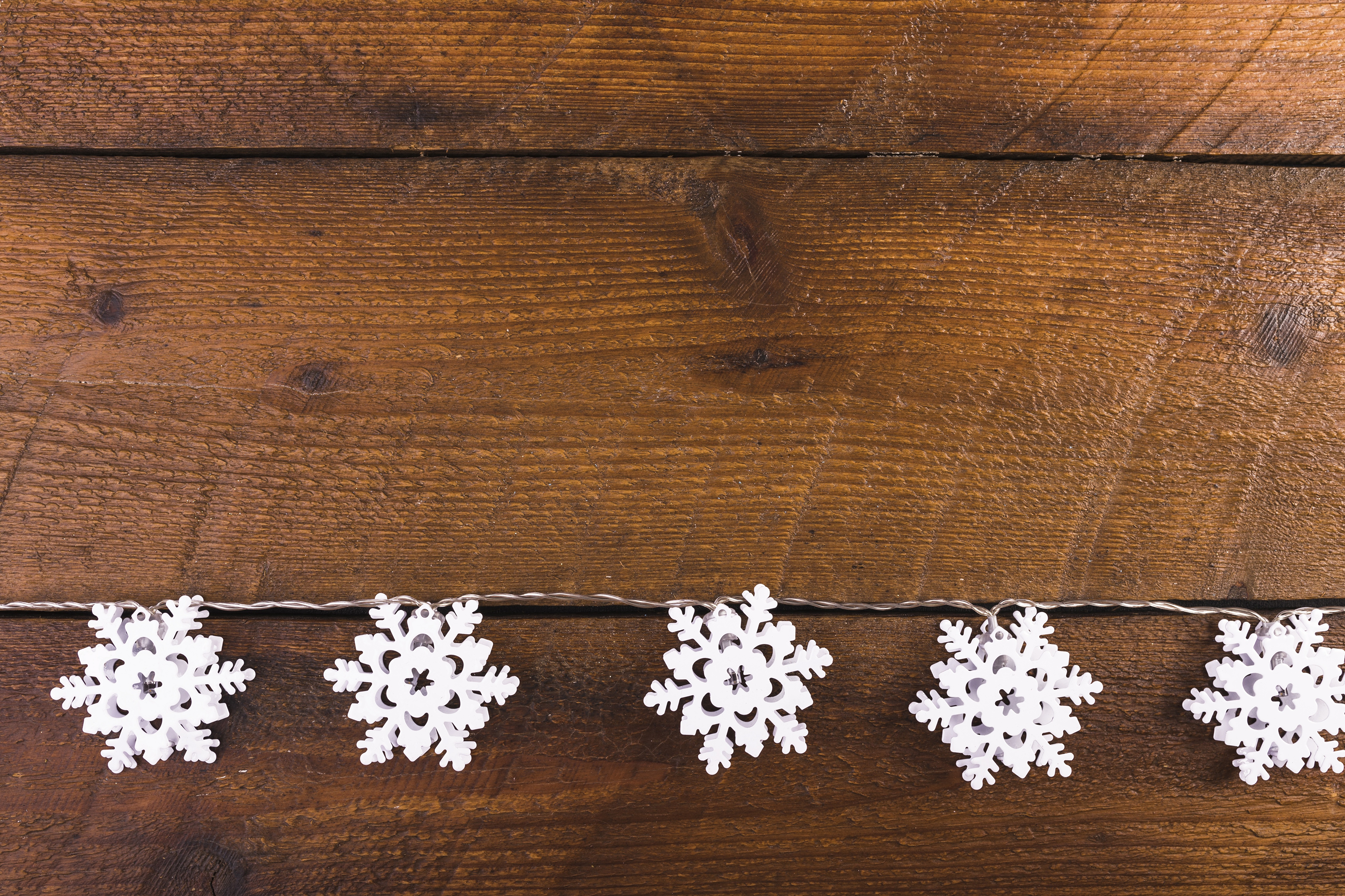Белые снежинки на деревянном фоне - 5120x3413