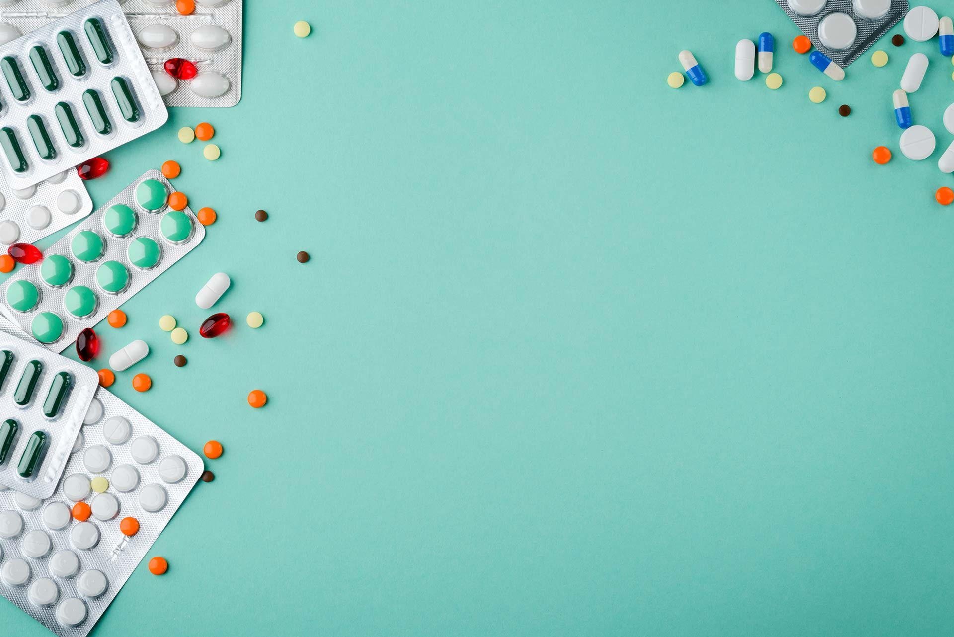 Разные таблетки на голубом фоне