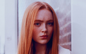 Нежная рыжеволосая актриса Линдси Лохан на сером фоне