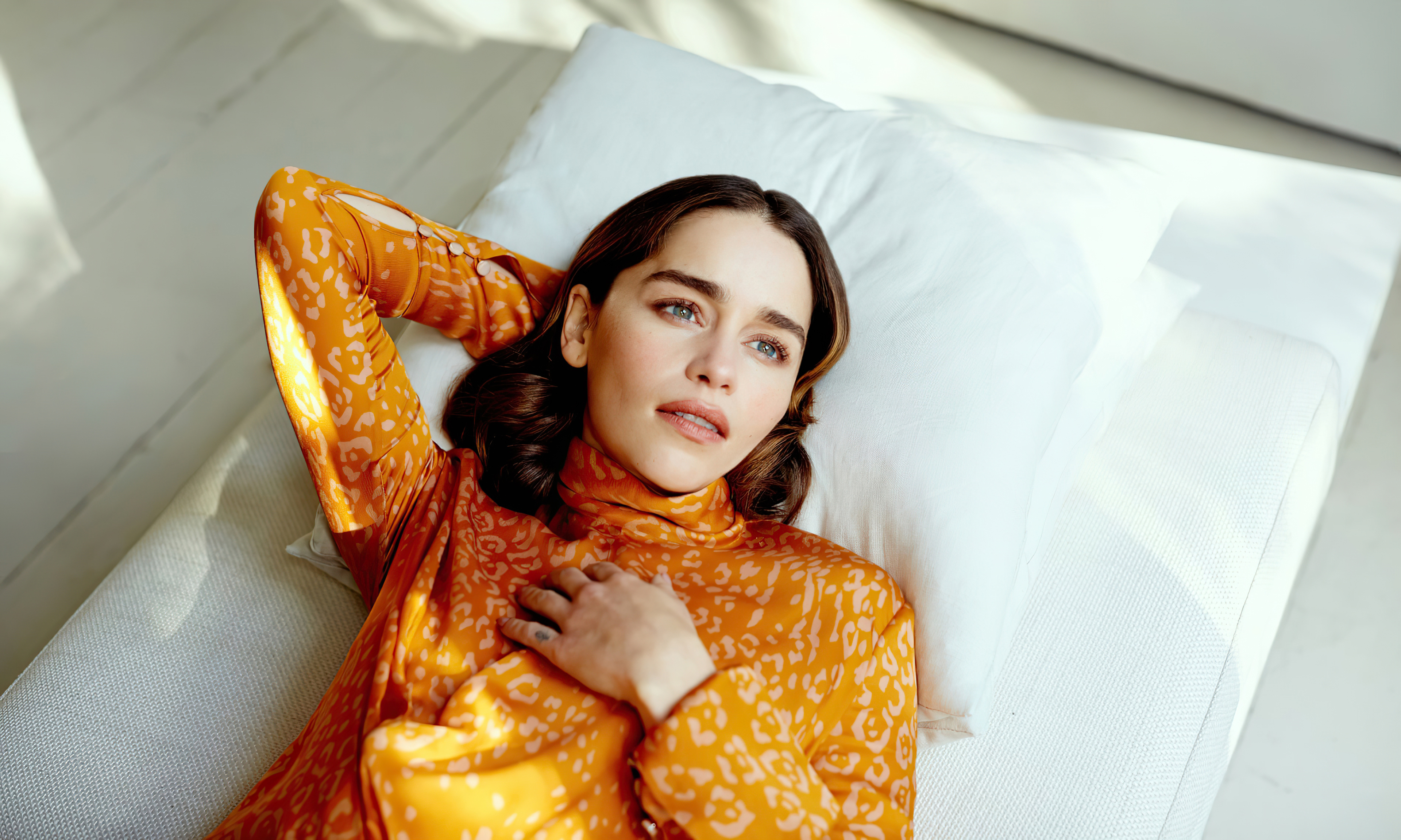 Актриса Эмилия Кларк лежит на белой подушке - 3840x2304