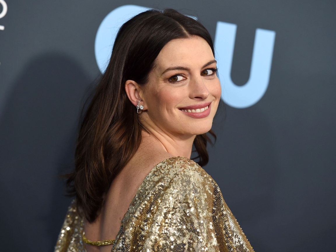 Улыбающаяся актриса Энн Хэтэуэй в ярком платье