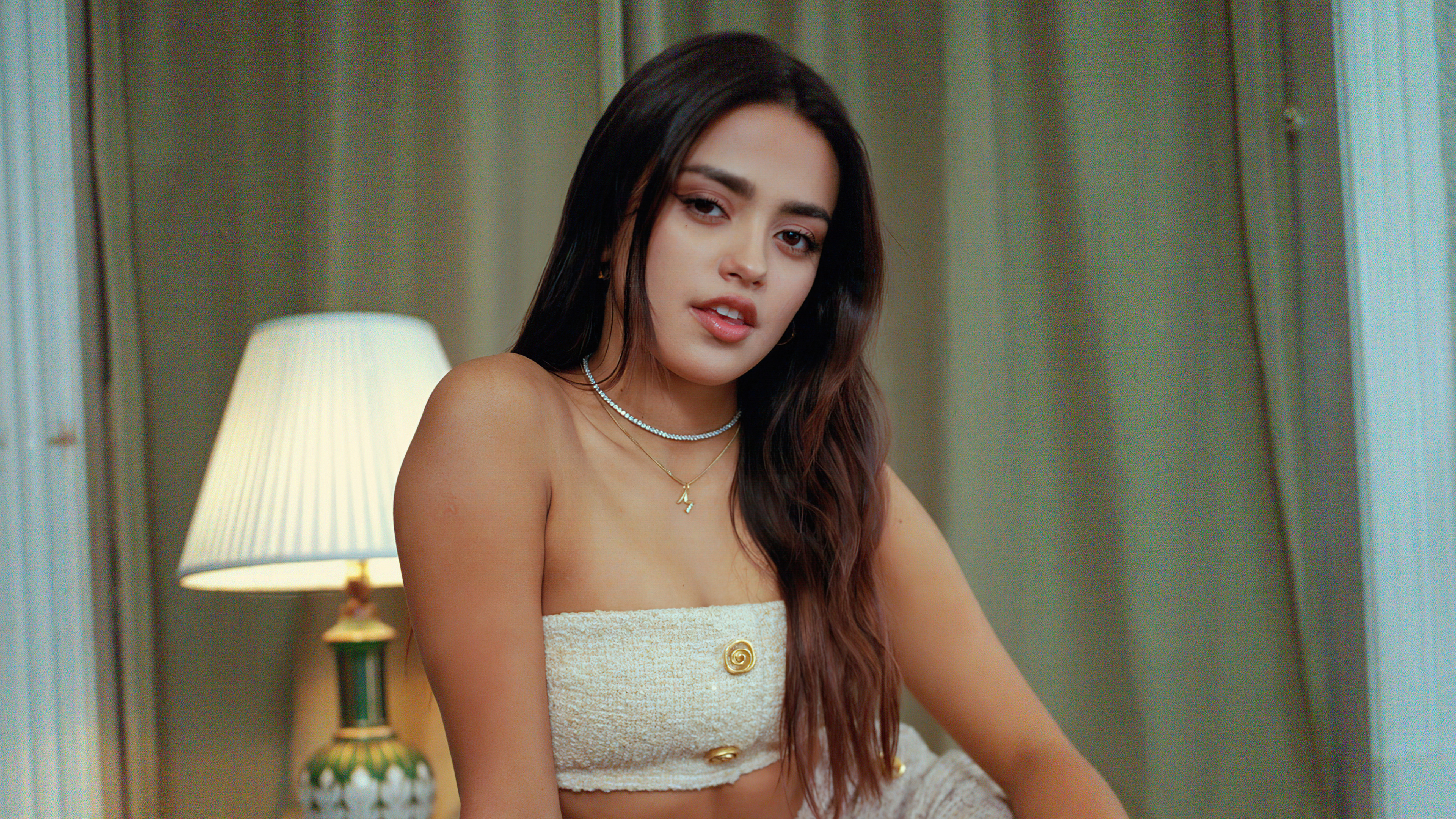 Актриса Ребекка Фергюсон розжимает цепь на белом фоне