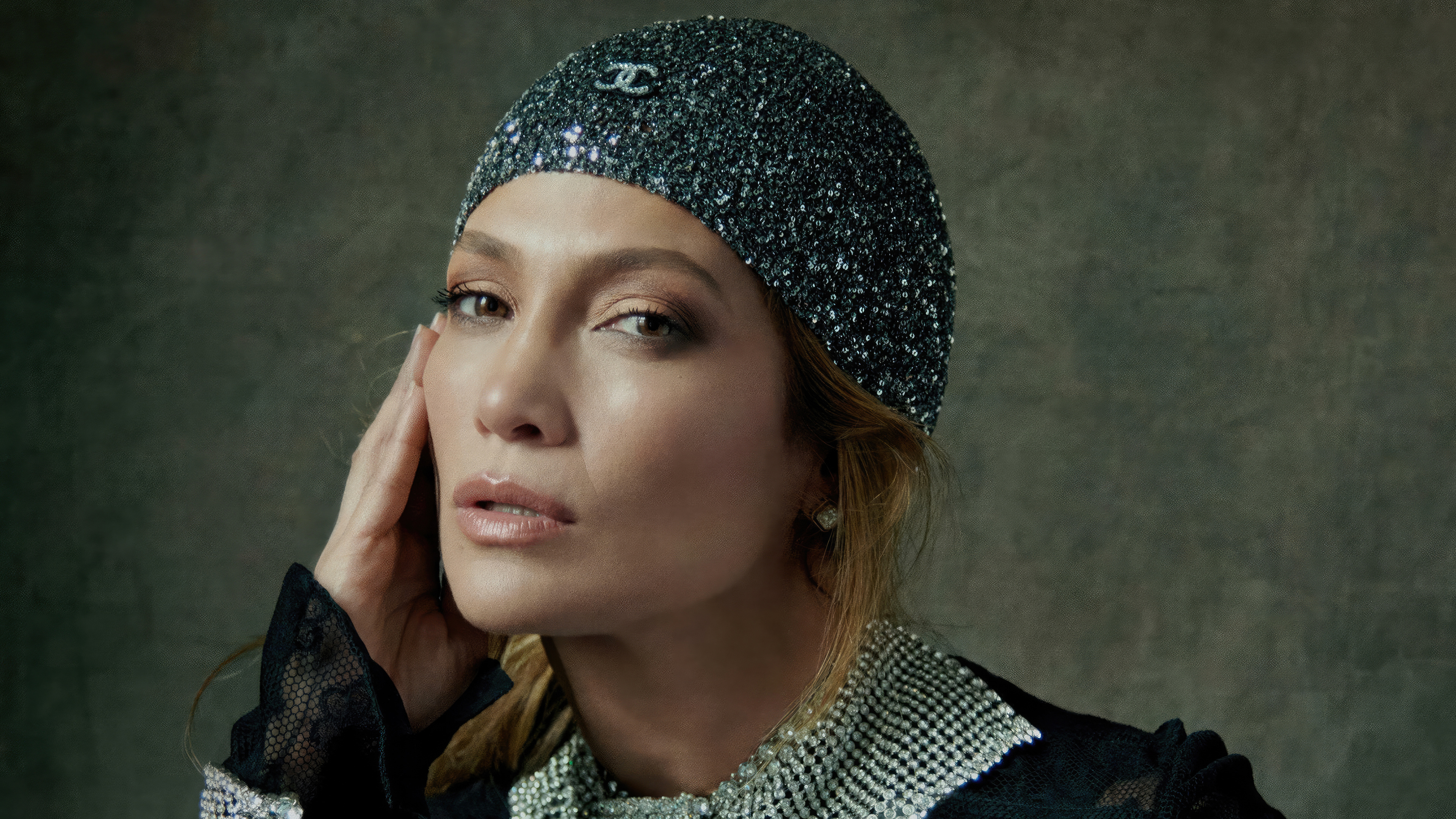 Кареглазая Дженнифер Лопес в блестящей шапке