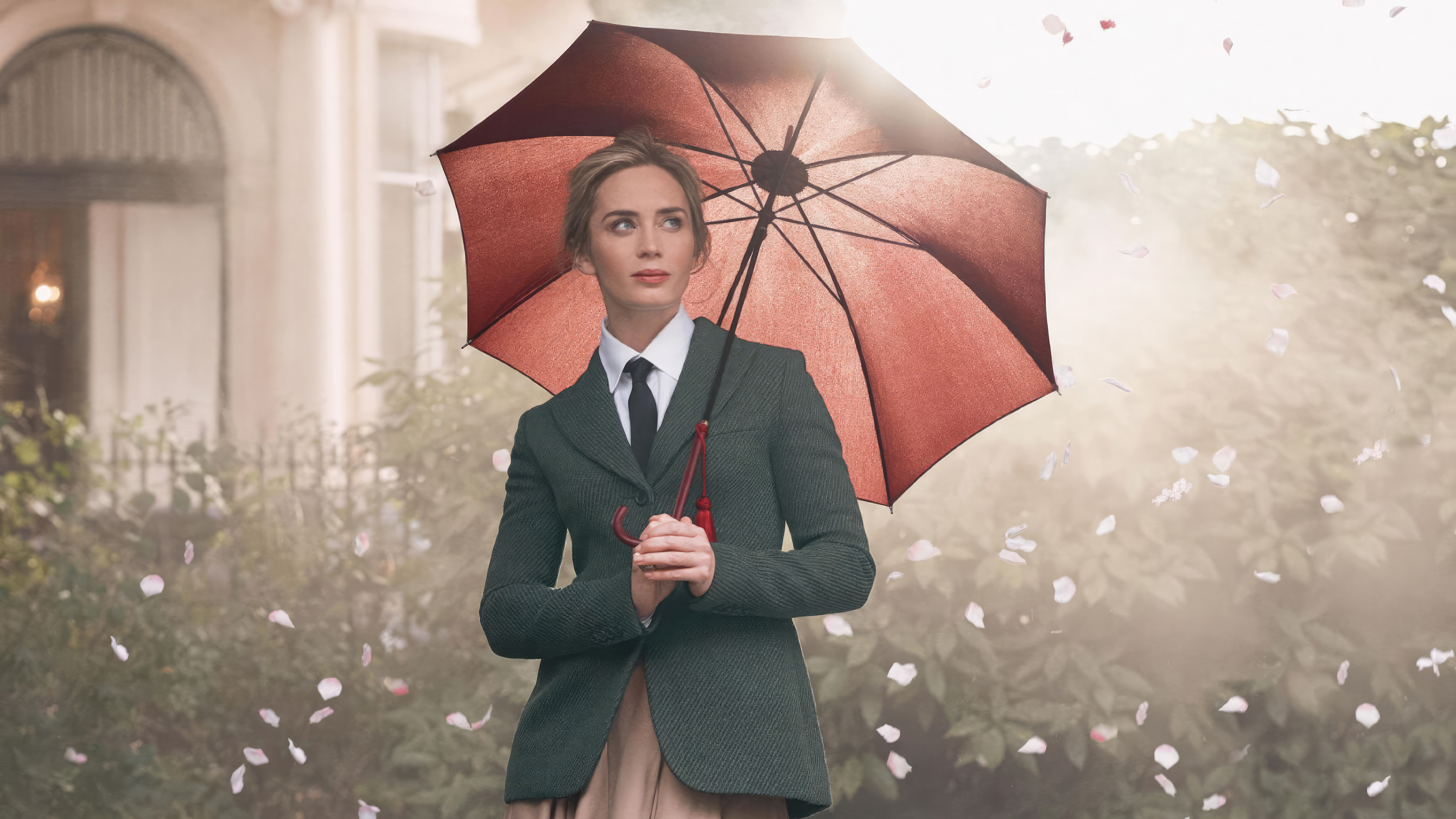 Актриса Эмили Блант стоит под зонтом - 5120x2880
