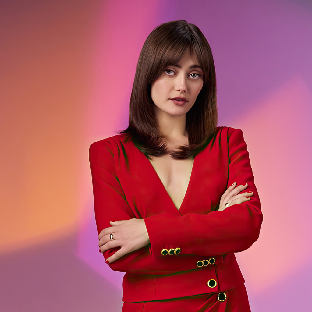 Актриса Элла Пернелл в красном костюме Обои для рабочего стола 1024x1024