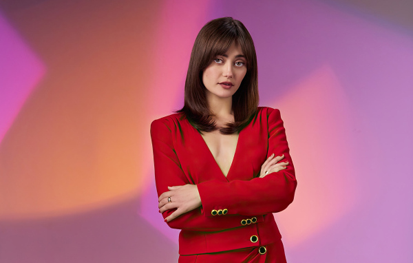 Актриса Элла Пернелл в красном костюме - 3840x2160