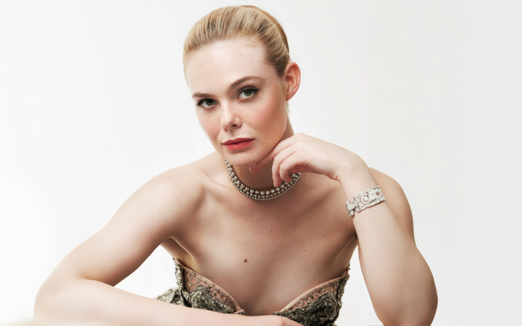 Американская актриса Эль Фэннинг на белом фоне Обои для рабочего стола 1680x1050