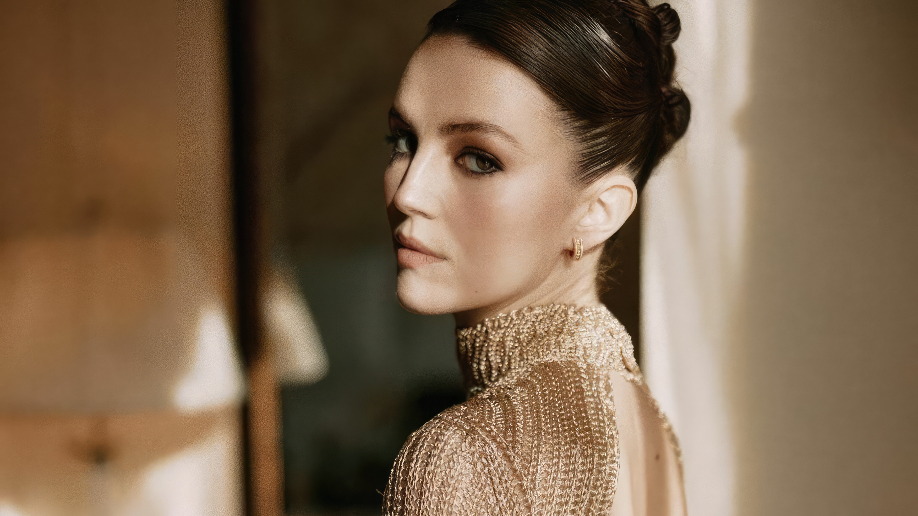 Актриса Ребекка Фергюсон розжимает цепь на белом фоне