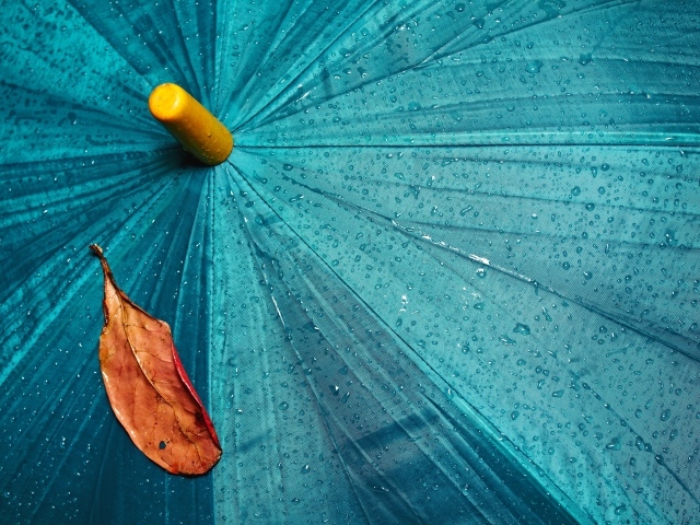 Желтый лист лежит на голубом мокром зонте - 5616x3744