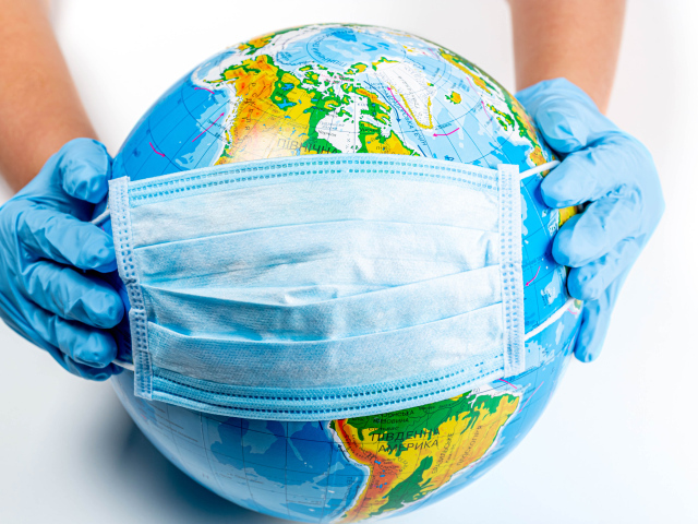 Руки одевают маску от коронавируса на глобус - 4050x2700
