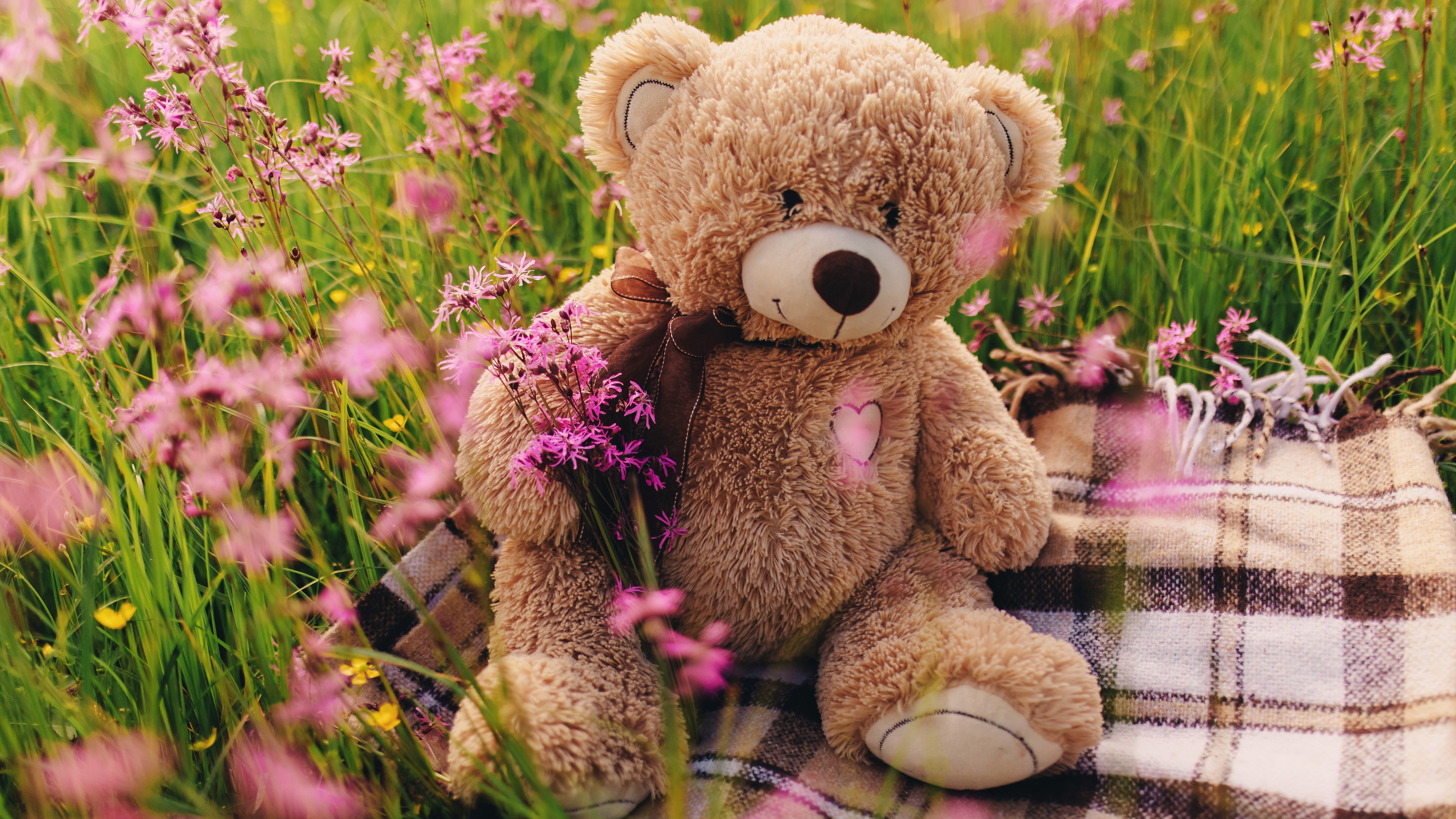 Медвежонок Тедди сидит в зеленой траве - 5120x2880