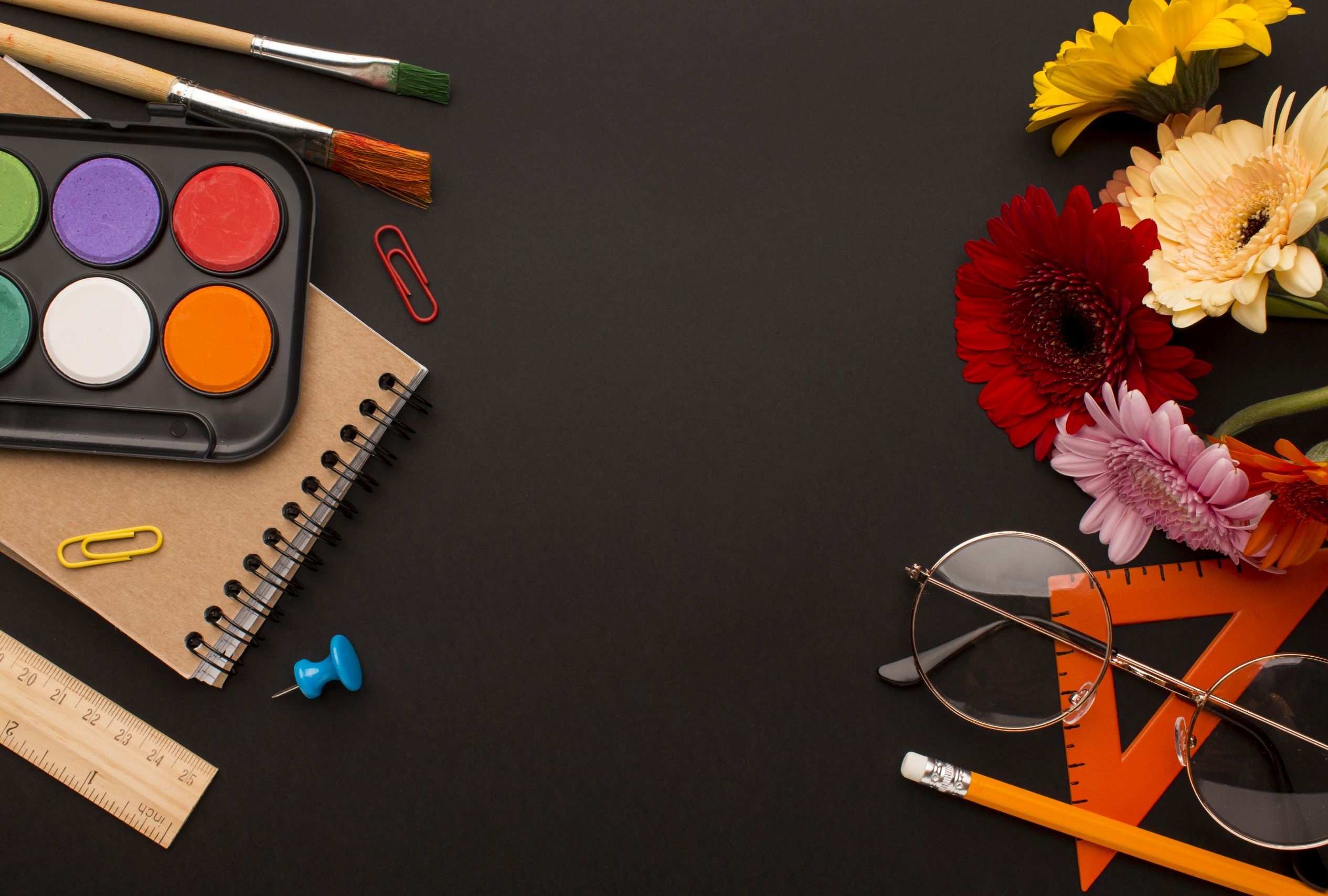 Обои: Канцелярские предметы, очки и герберы на черном фоне