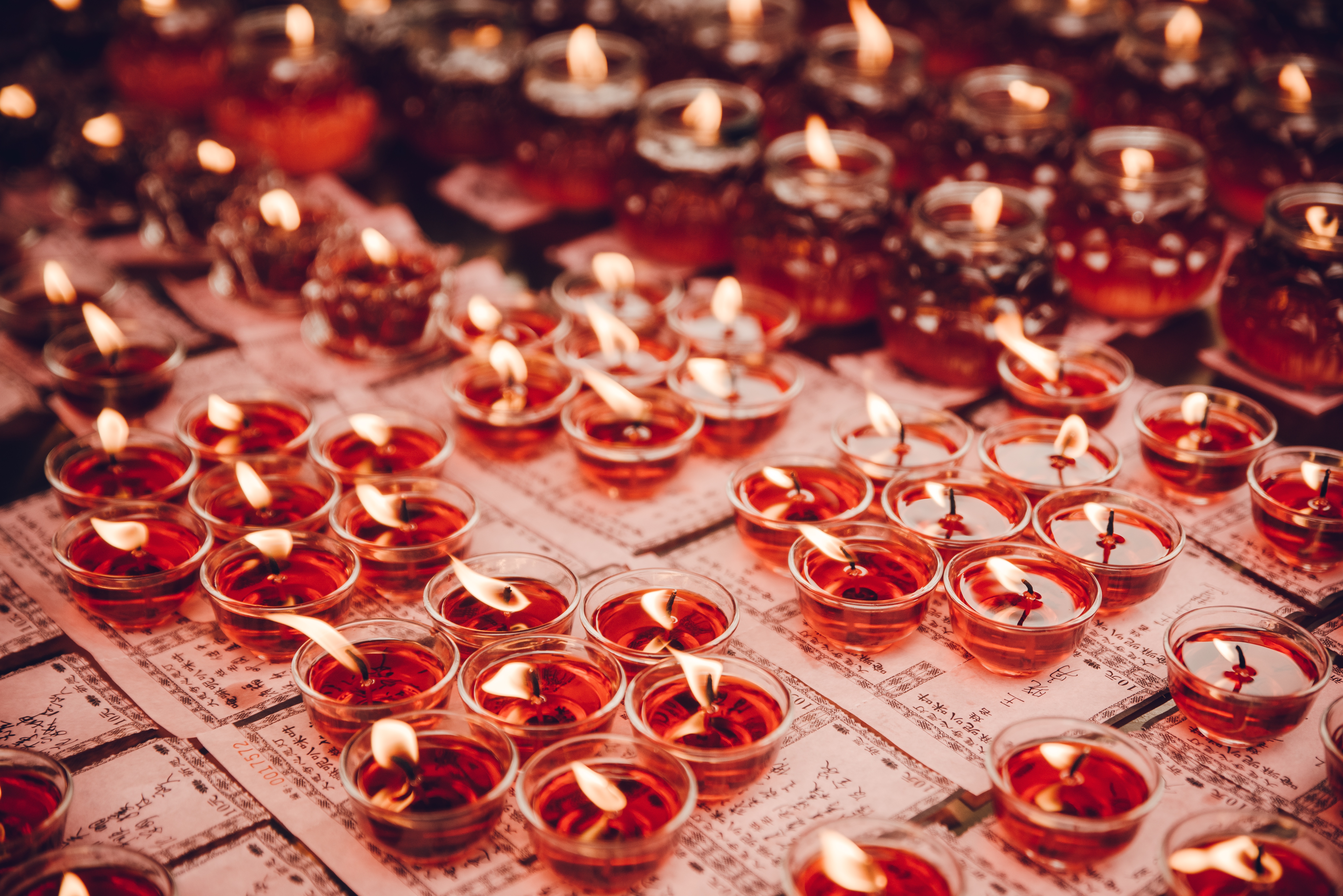 Маленькие зажженные ароматные красные свечи - 7360x4912