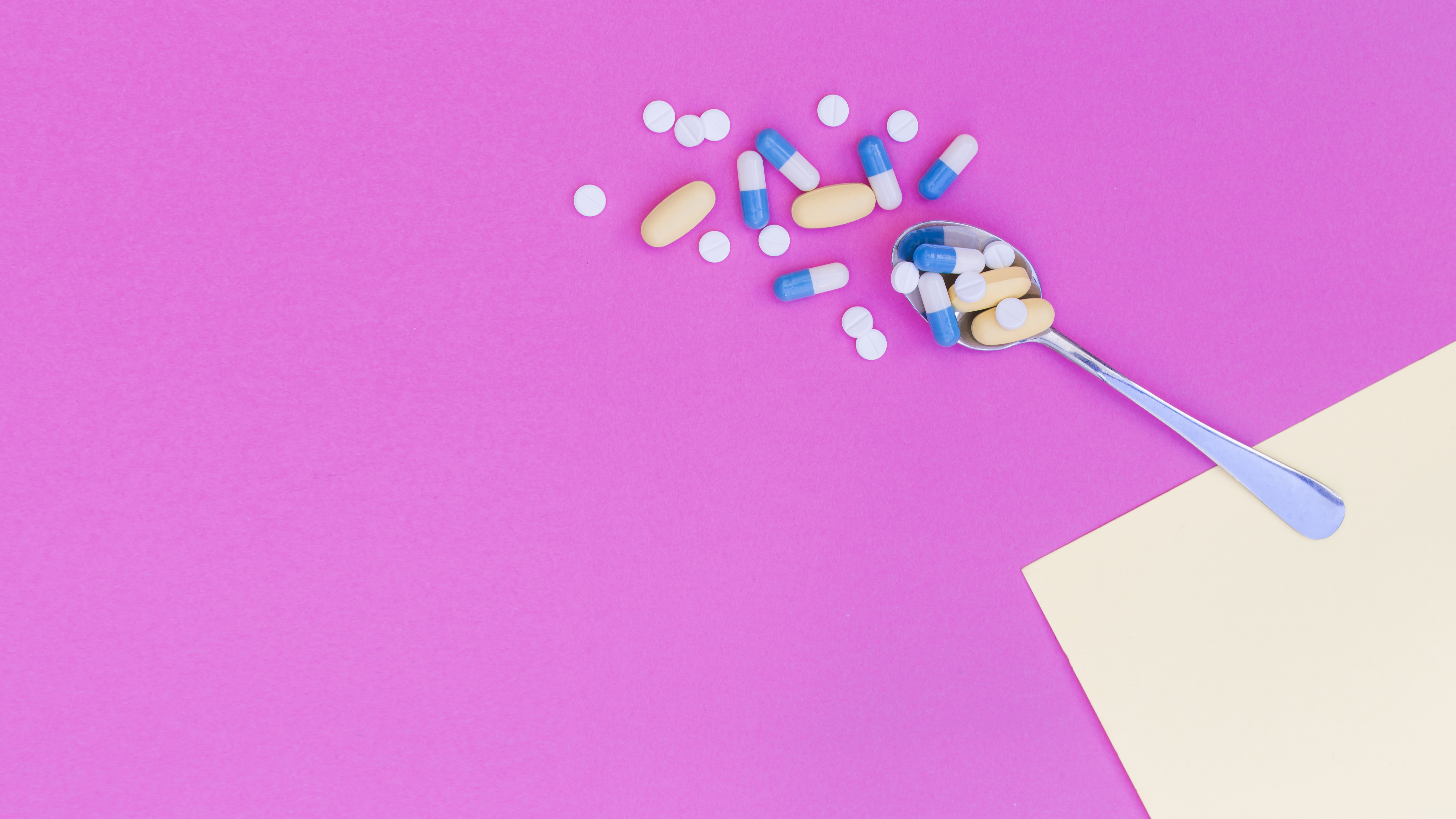 Таблетки с ложкой на розовом фоне - 6485x3648