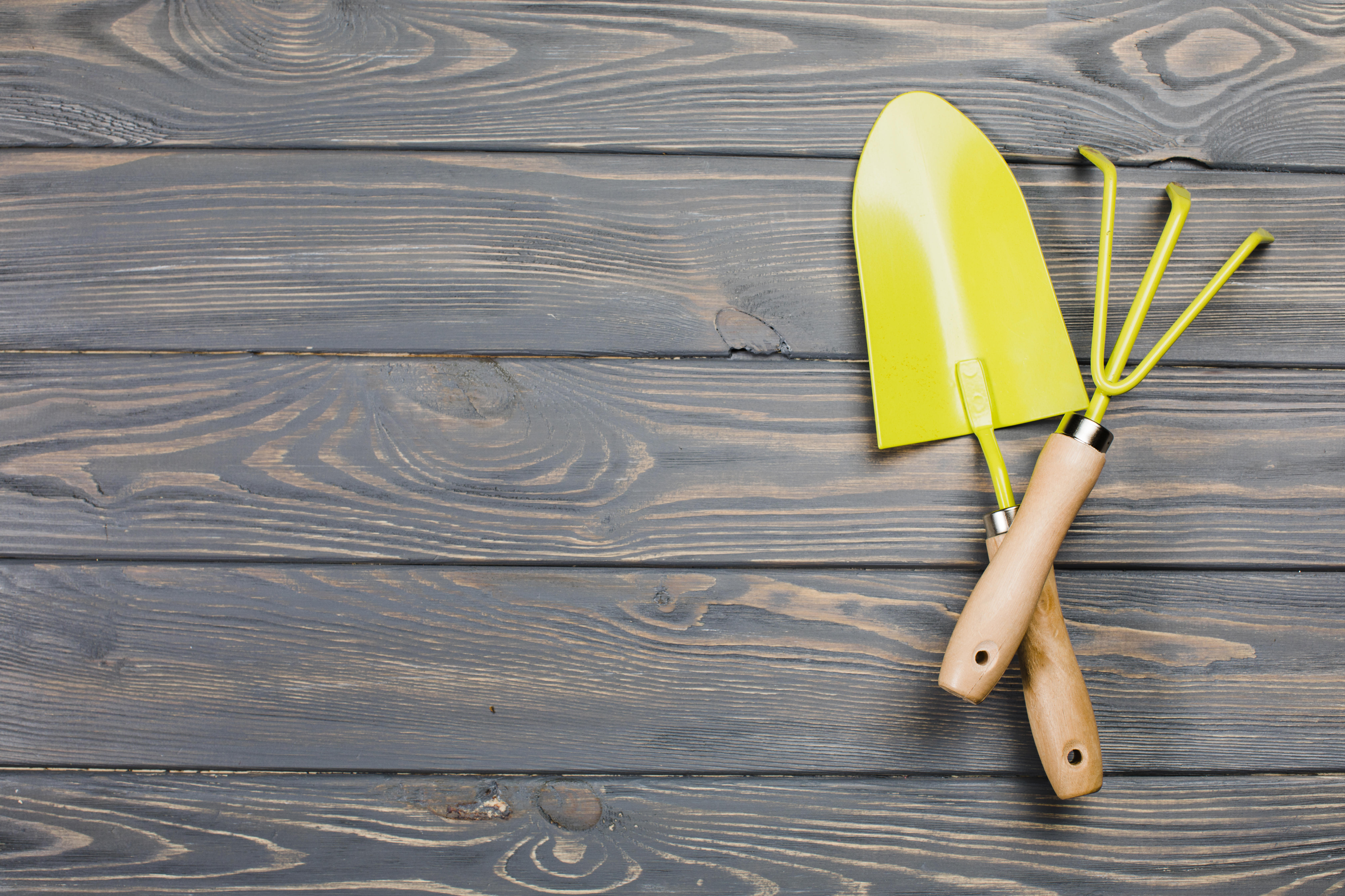 Желтые садовые принадлежности на деревянном фоне - 6720x4480