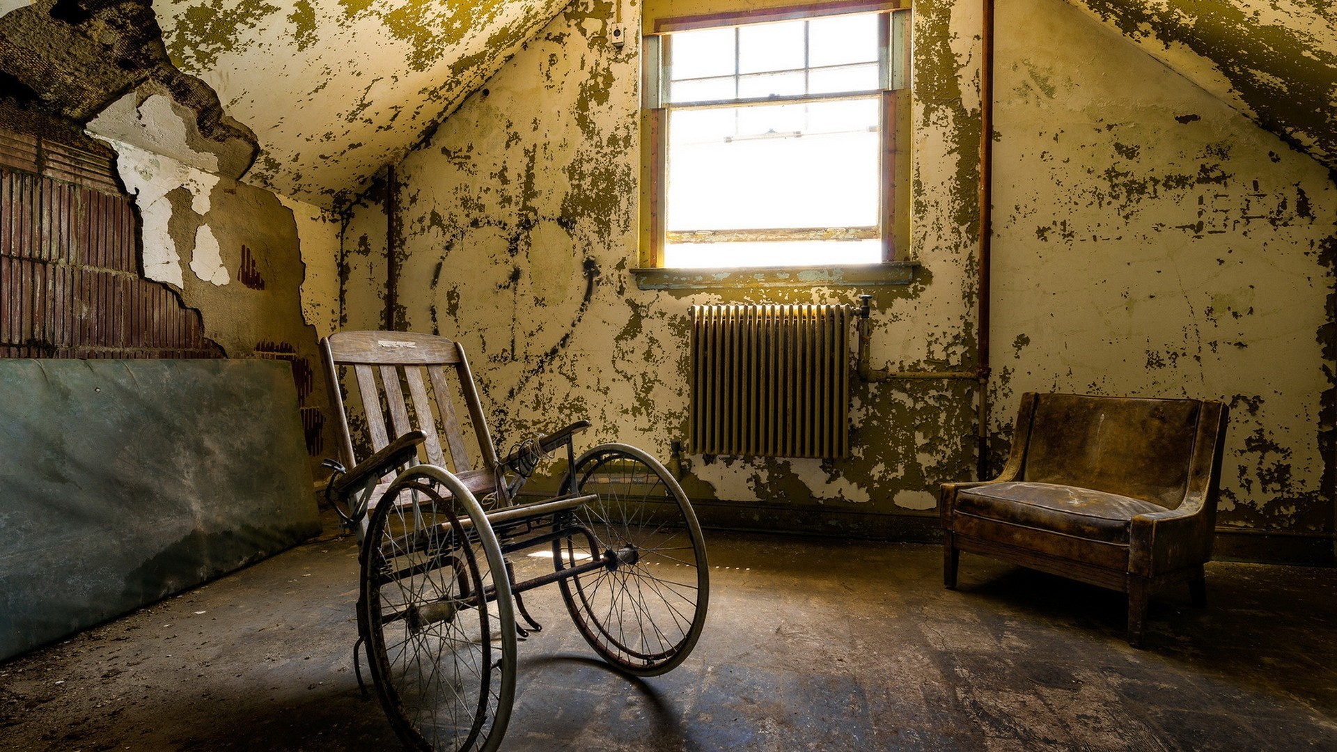 Обои: Пустое инвалидное кресло в заброшенном доме