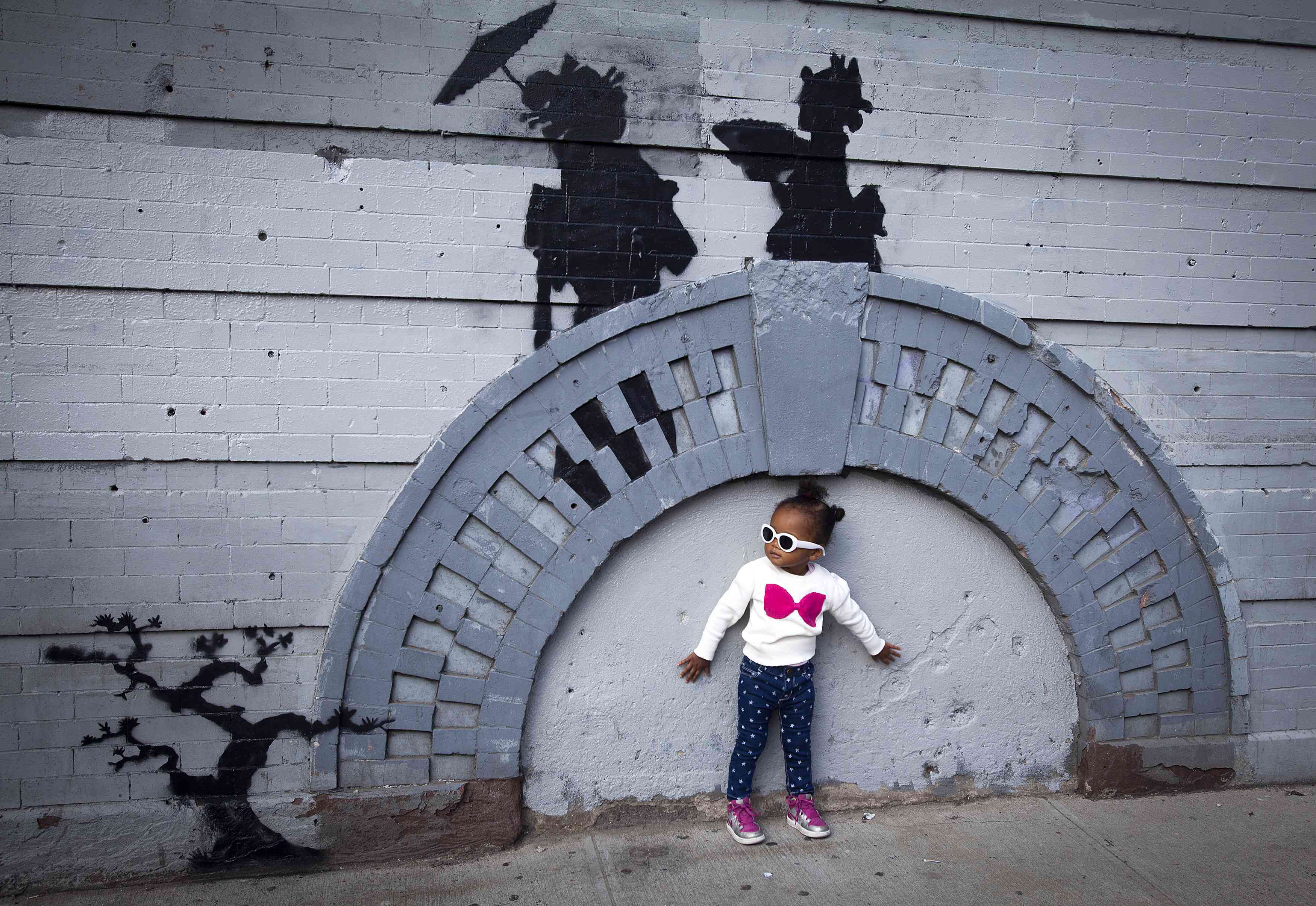 Нарисованная на стене маленькая девочка с мыльными пузырями