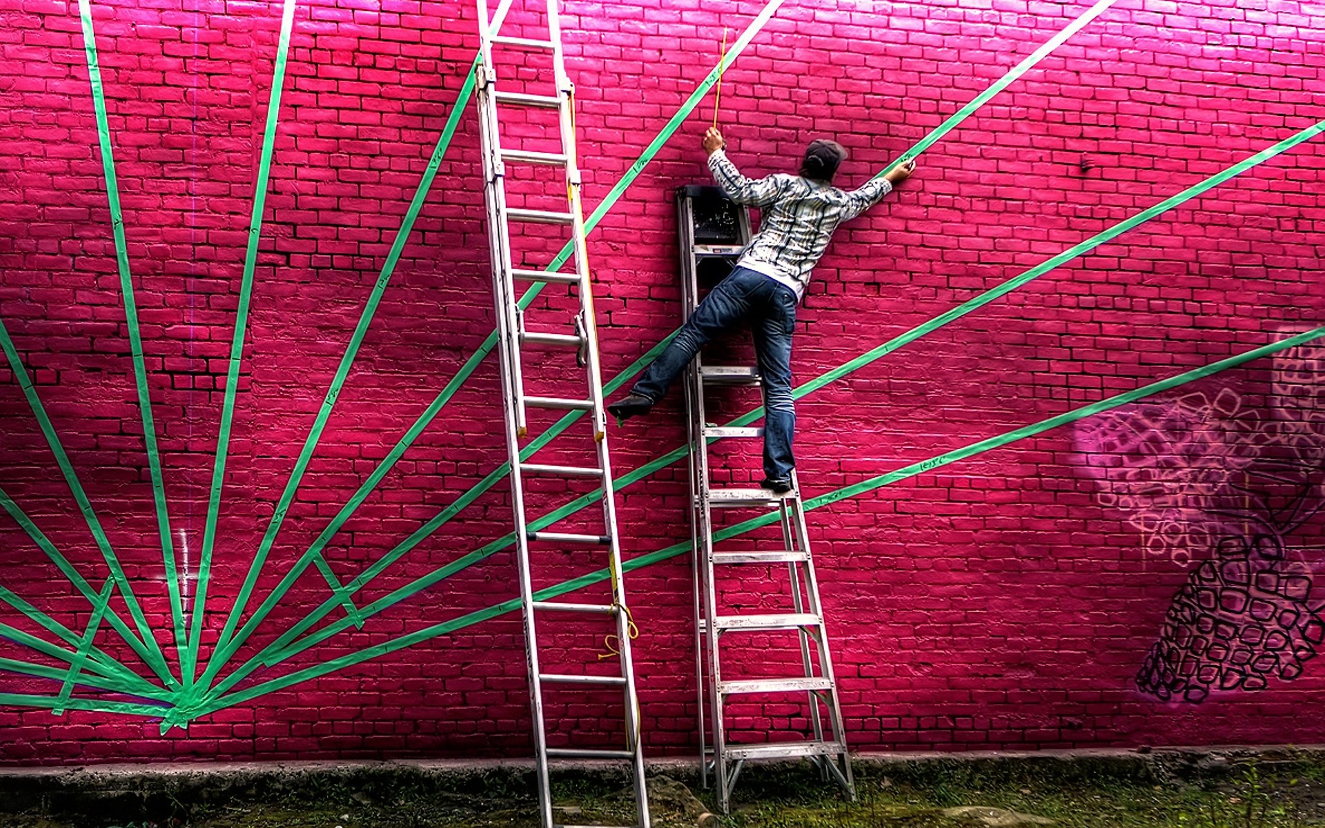 Нарисованная на стене маленькая девочка с мыльными пузырями