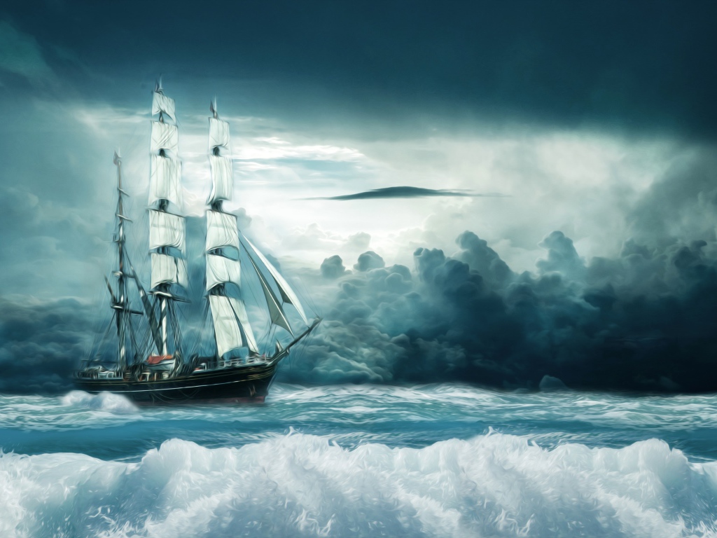 Нарисованный корабль в бушующем море Обои для рабочего стола 1024x768