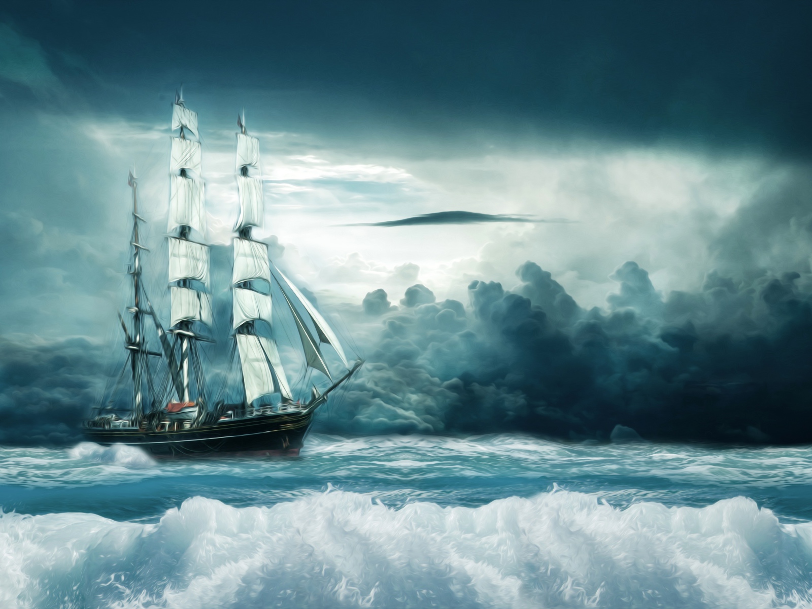 Нарисованный корабль в бушующем море Обои для рабочего стола 1600x1200