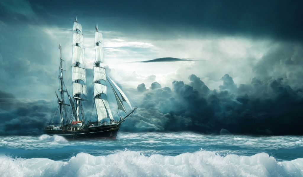 Нарисованный корабль в бушующем море Обои для рабочего стола 1024x600