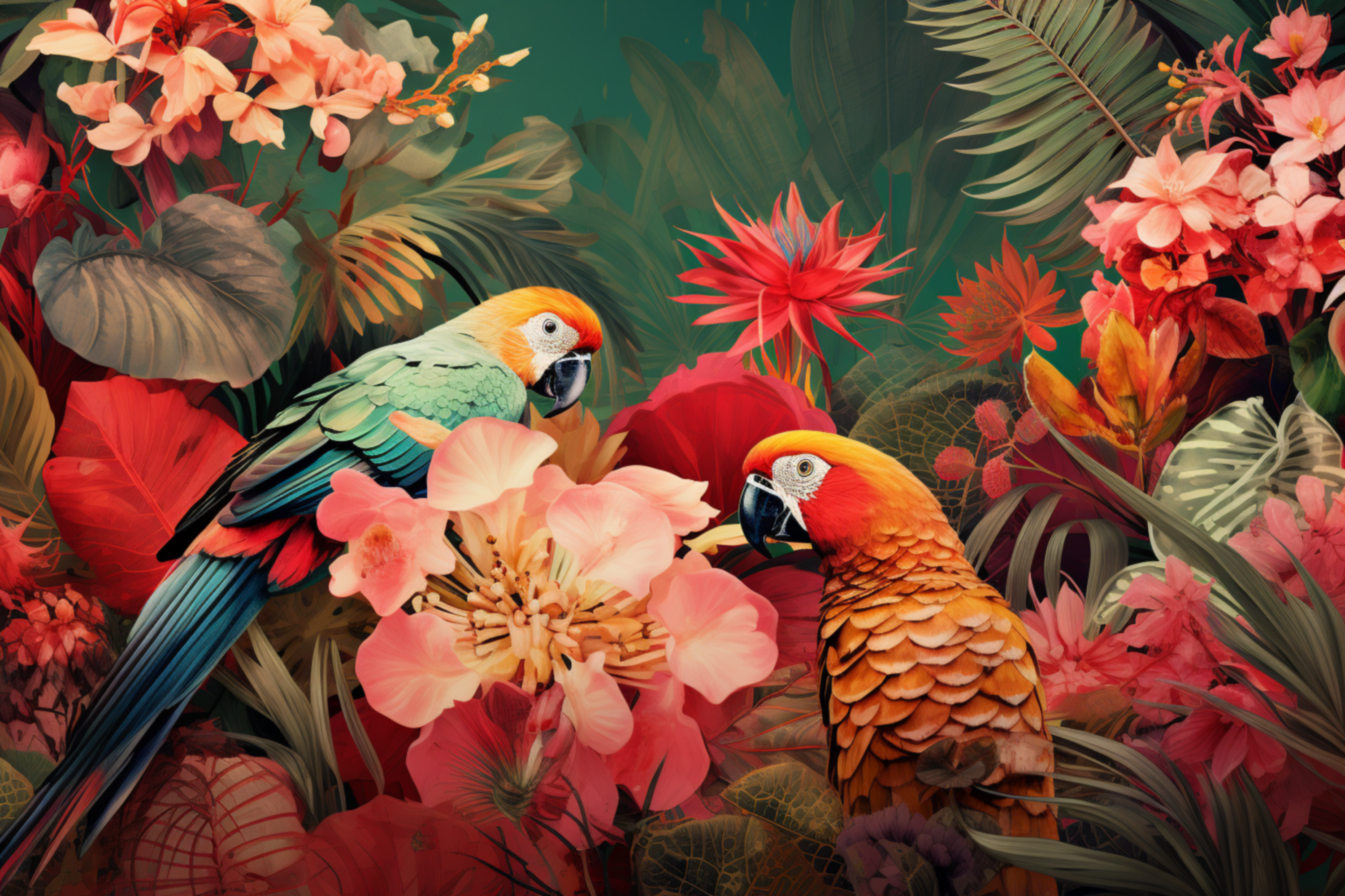 Два красивых попугая в цветах - 3000x2000