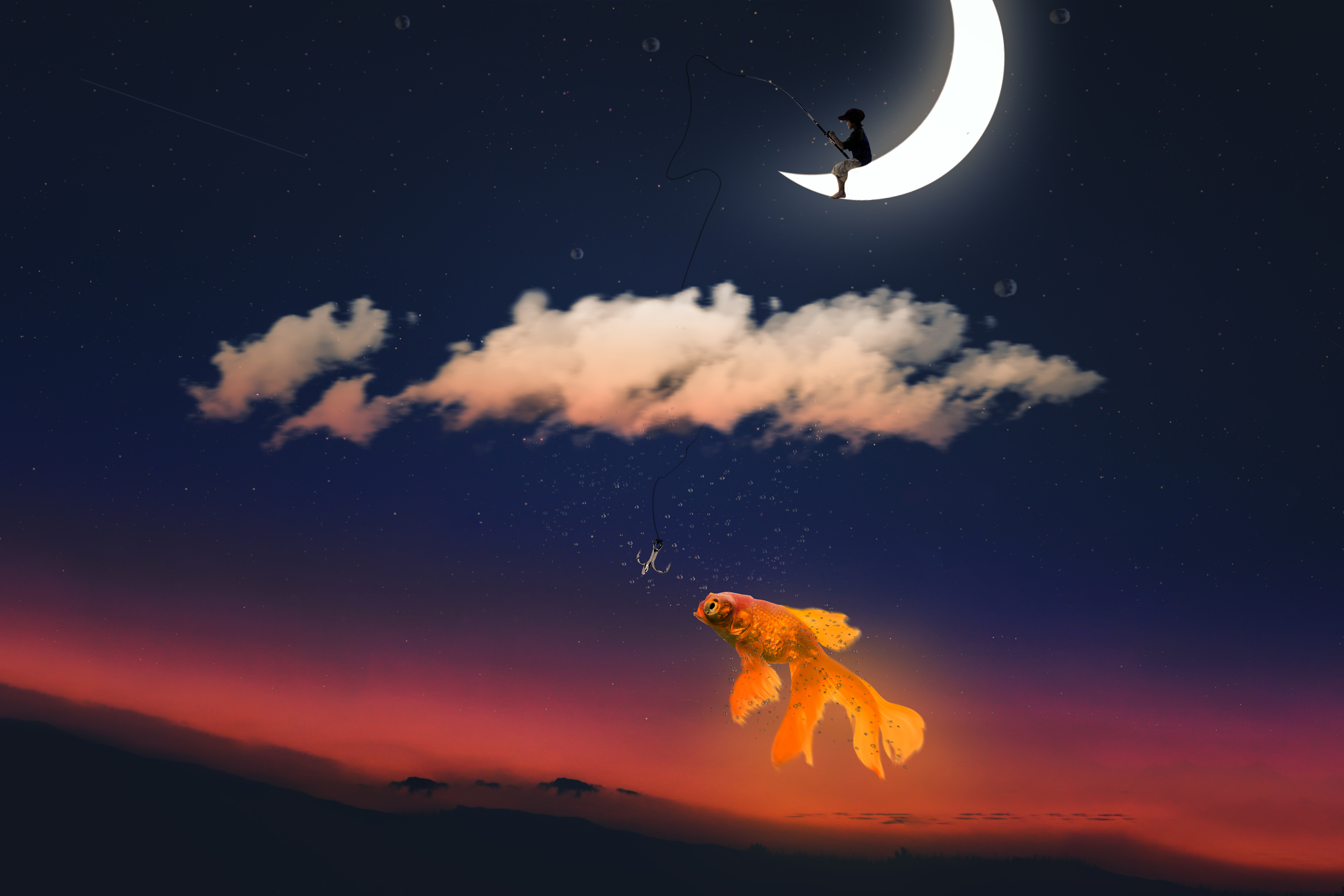 Мальчик на месяце ловит золотую рыбку фэнтези - 3000x2000