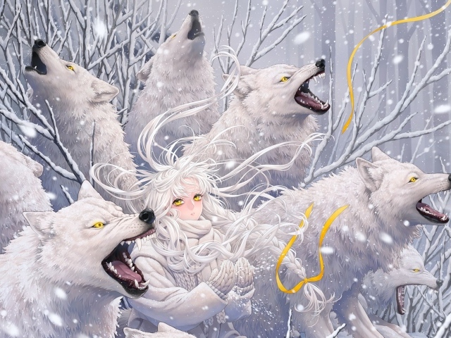 Обои: Снежная девушка с белыми волками фэнтези