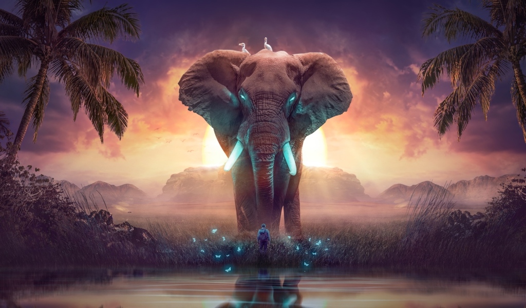 Фантастический слон у воды с человеком Обои для рабочего стола 1024x600