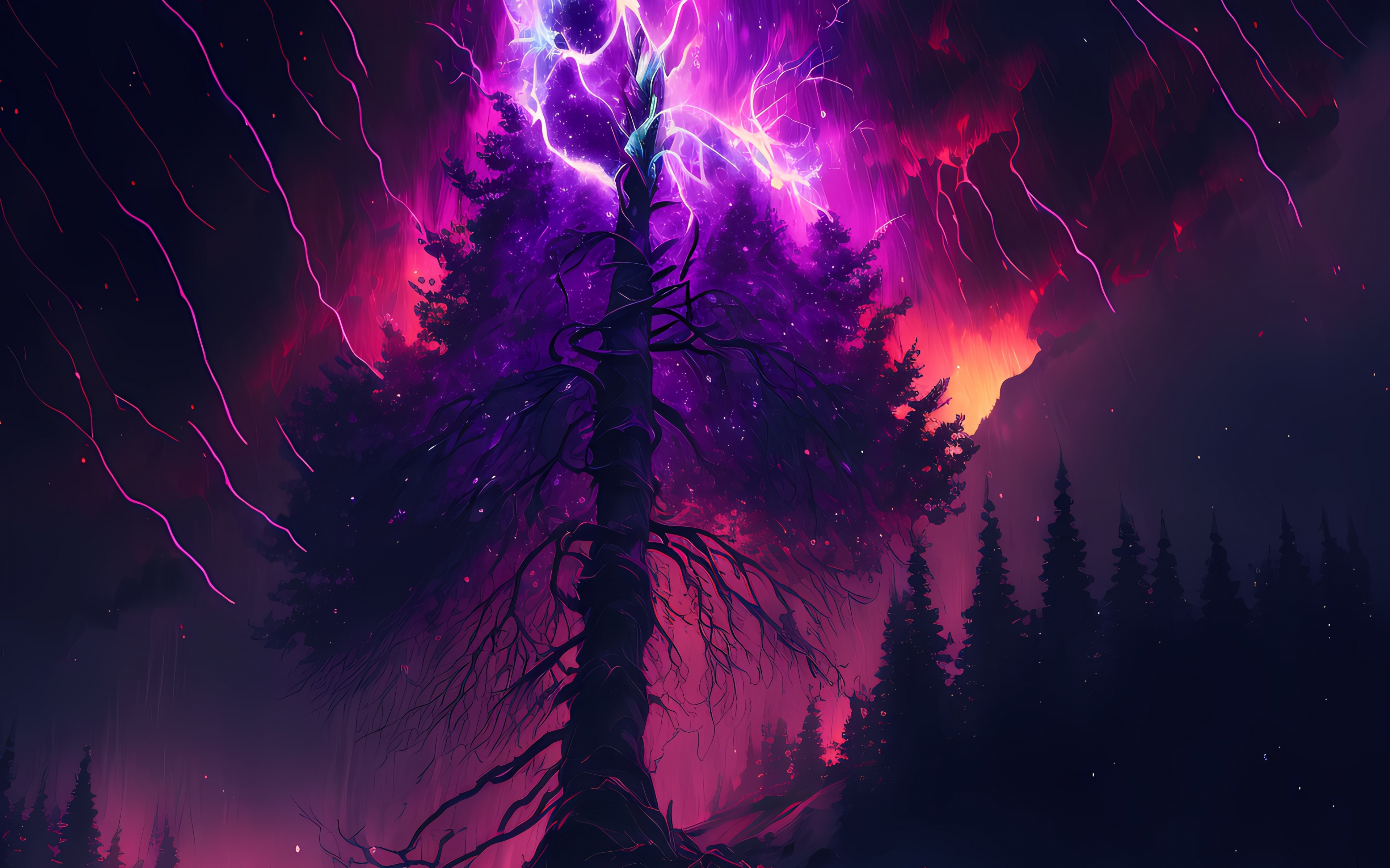 Молния разрывается над старым деревом - 3840x2400