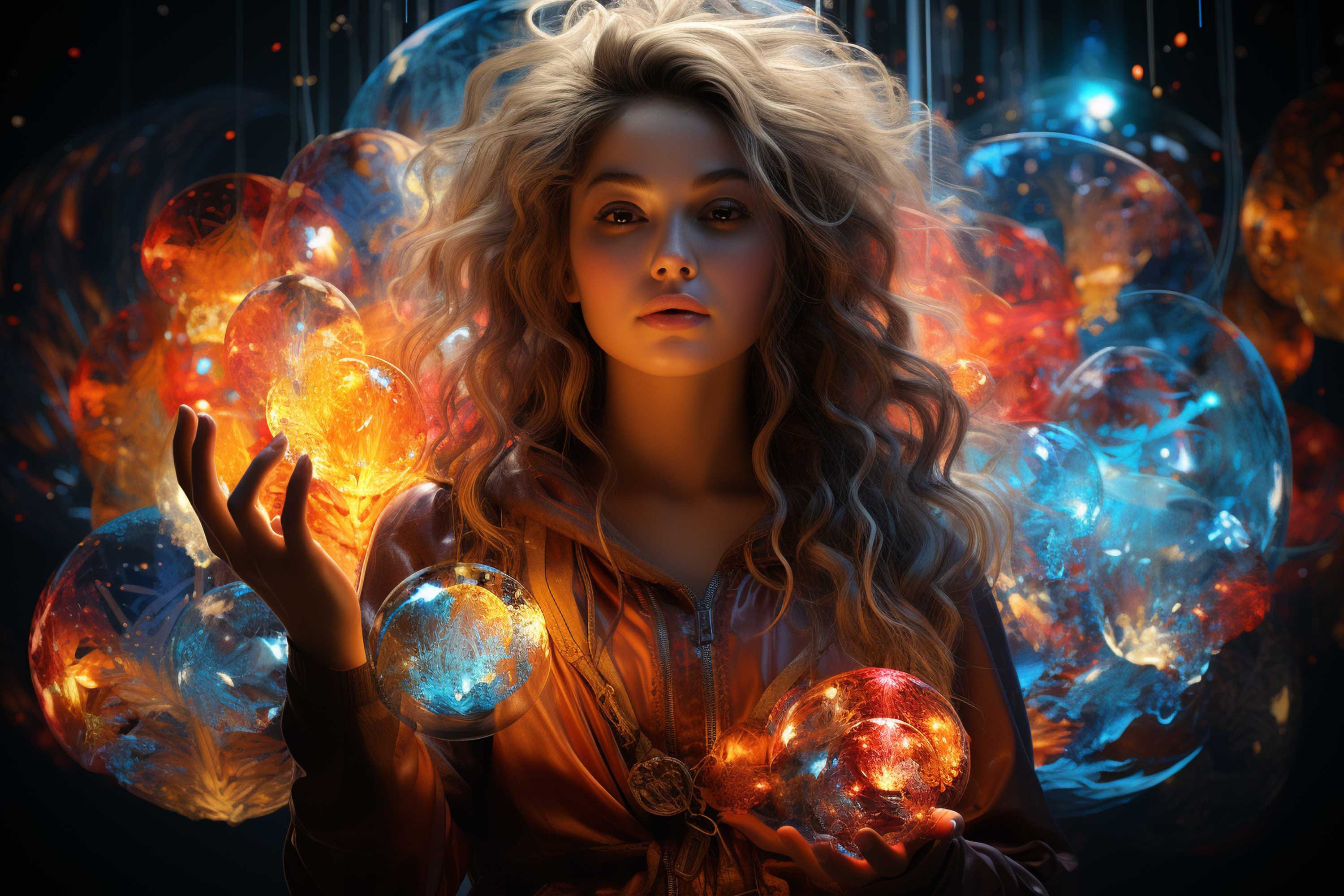 Красивая девушка с фантастическими светящимися шарами - 3000x2000