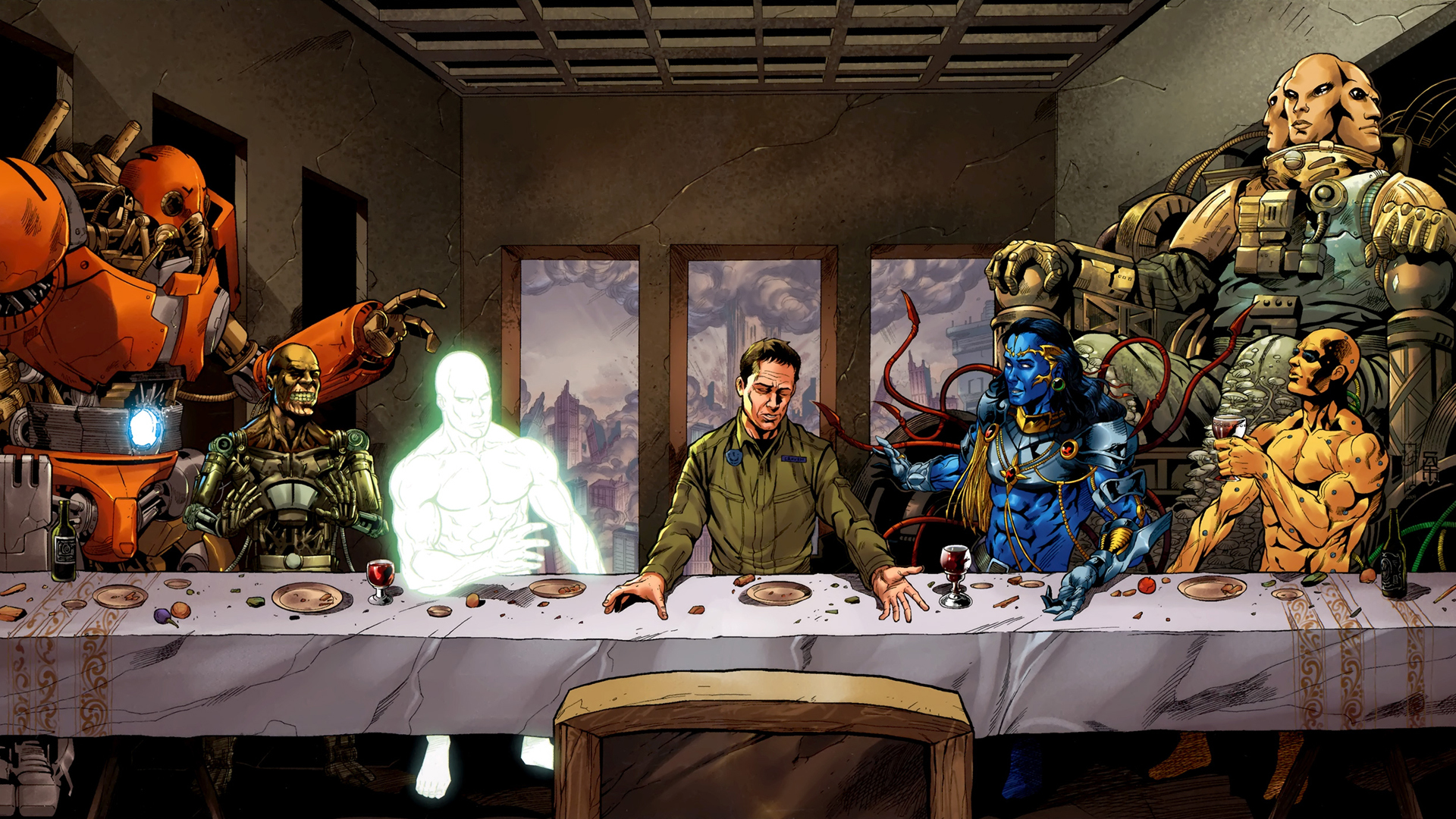 Человек обедает с роботами - 1920x1080