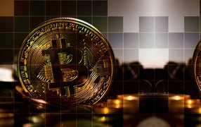 Монеты биткоин на фоне в клетку