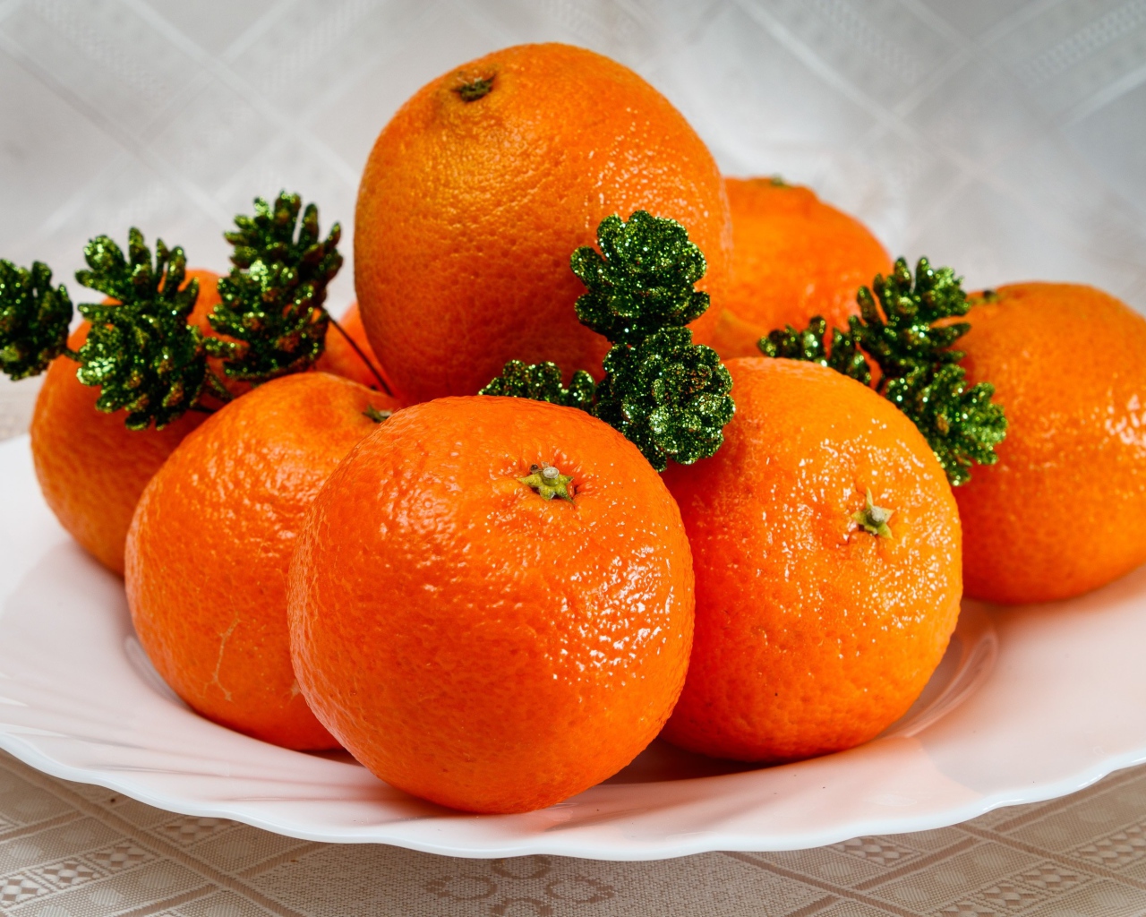 Много оранжевых мандаринов на тарелке с шишками - 3000x2000