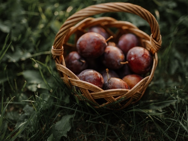 Обои: Корзина розовых слив стоит на траве