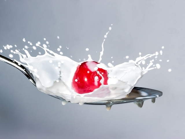 Обои: Красная черешня в ложке с молоком на сером фоне