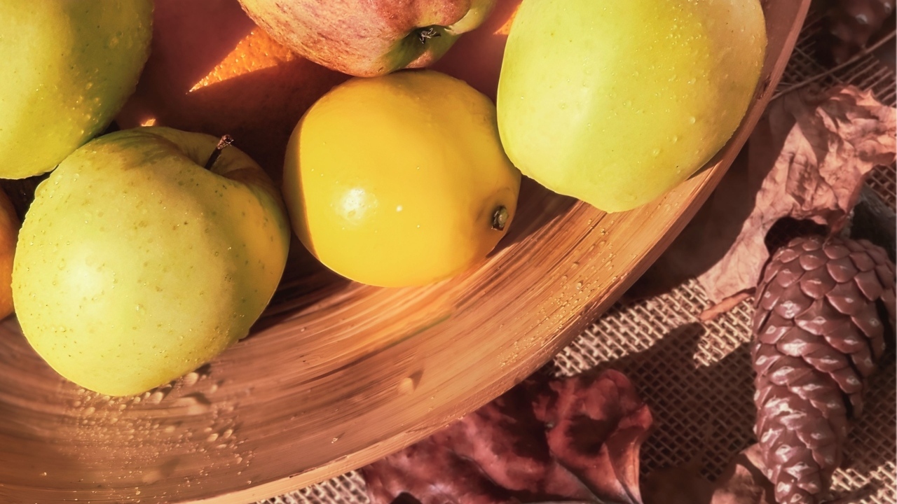 Чистые спелые яблоки на столе с шишкой - 6000x4000