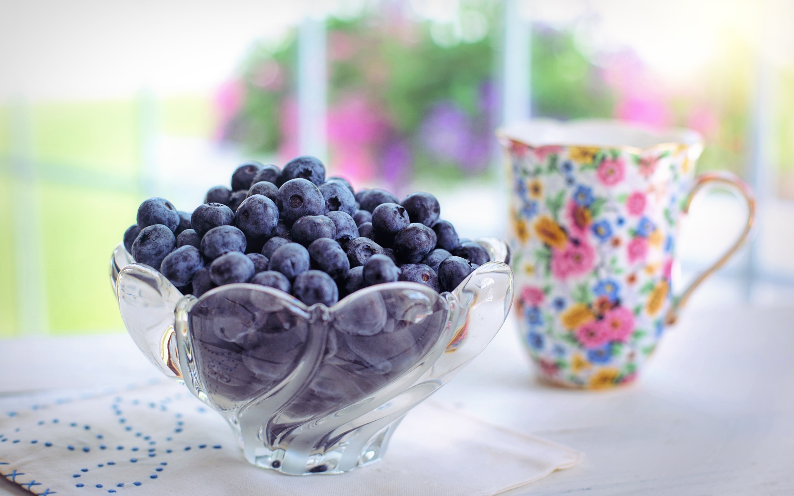 Черника в стеклянной вазе на столе с кружкой Обои для рабочего стола 2560x1600