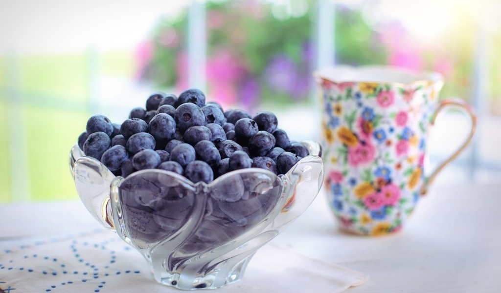 Черника в стеклянной вазе на столе с кружкой Обои для рабочего стола 1024x600