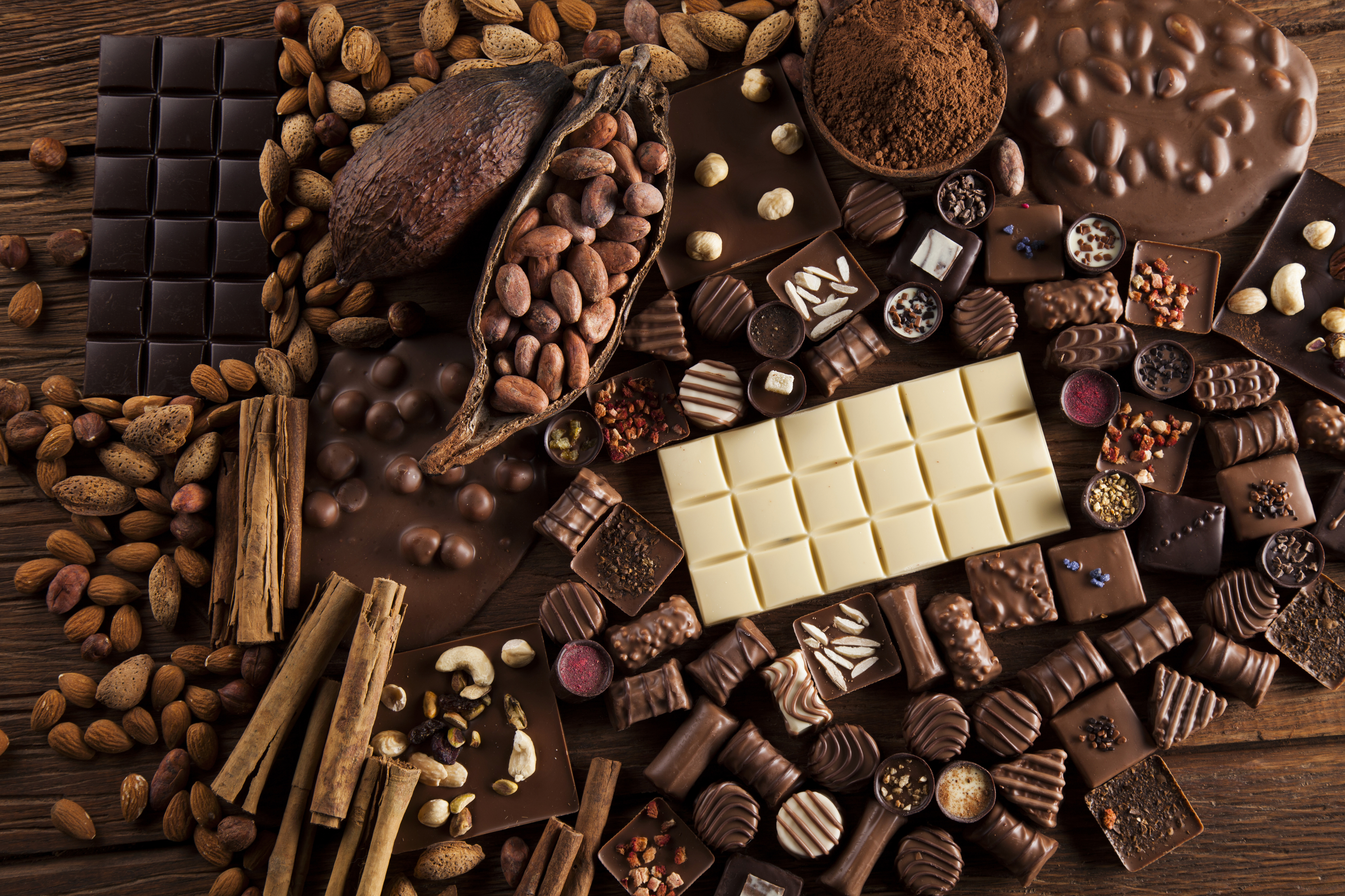 Шоколад и шоколадные конфеты с орехами - 5616x3744