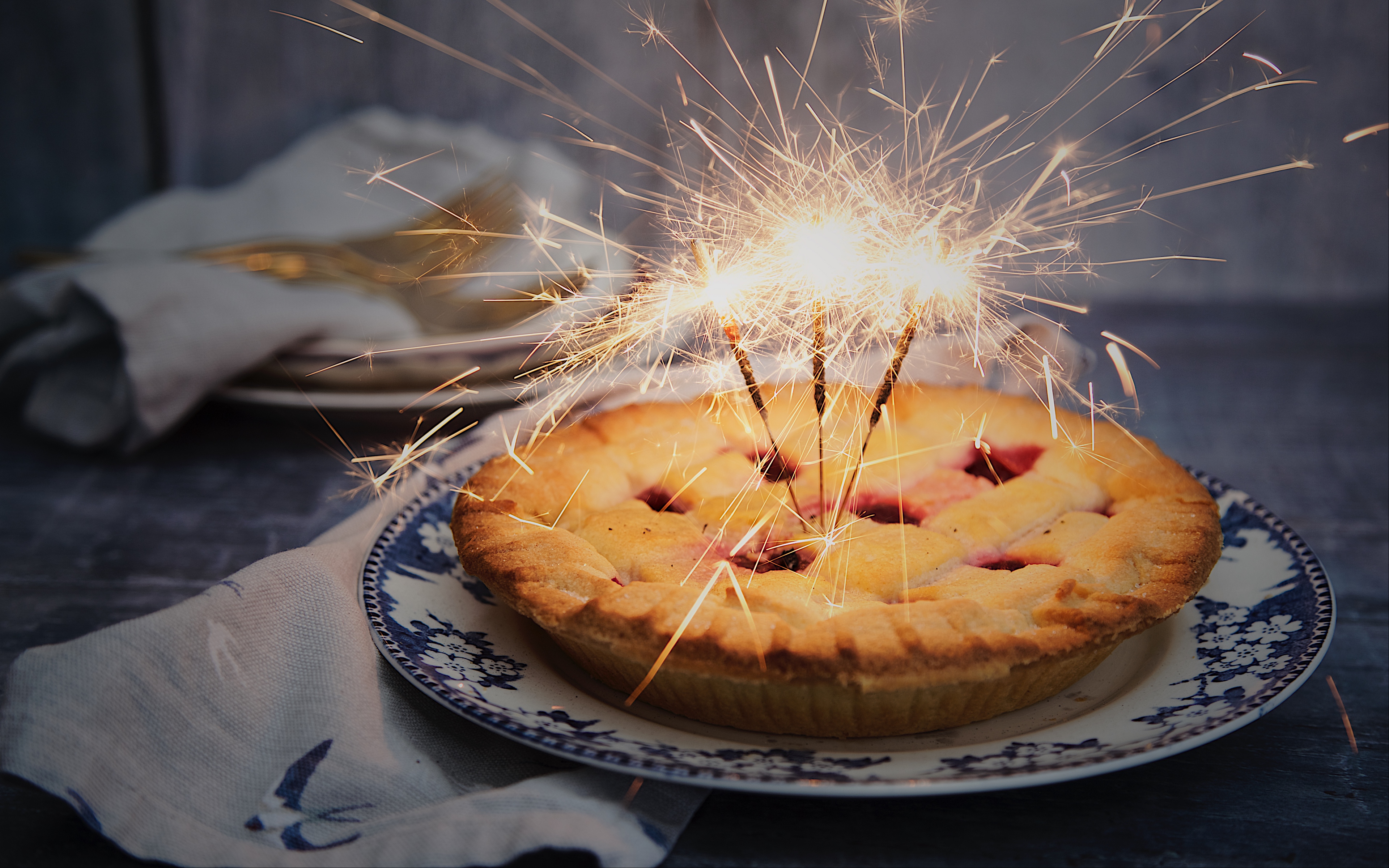 Аппетитный пирог с зажженными бенгальскими огнями - 3840x2400