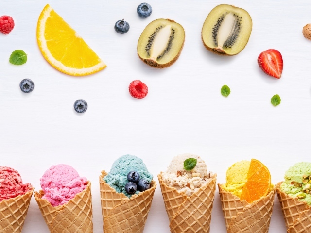 Обои: Фруктовое мороженое в вафельных рожках на белом фоне с ягодами